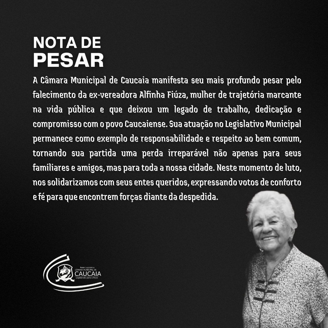 A Câmara Municipal de Caucaia manifesta seu mais profundo pesar pelo falecimento da ex-vereadora Alfinha Fiúza, mulher de trajetória marcante na vida pública e que deixou um legado de trabalho, dedicação e compromisso com o povo Caucaiense. Sua atuação no Legislativo Municipal permanece como exemplo de responsabilidade e respeito ao bem comum, tornando sua partida uma perda irreparável não apenas para seus familiares e amigos, mas para toda a nossa cidade. Neste momento de luto, nos solidarizamos com seus entes queridos, expressando votos de conforto e fé para que encontrem forças diante da despedida.